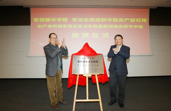 随后赵皖平副院长与赵良庆校长一起为“水产增养殖安徽省重点实验室智慧渔业研究中心”揭牌,江河所长与戴昕副校长签署了战略合作协议。