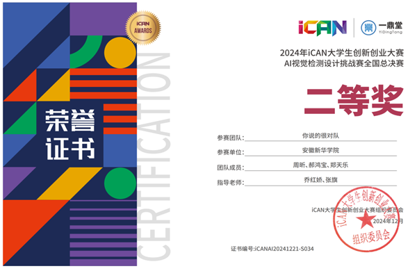 首次!新突破!beat365网登学子获2024年iCAN大学生创新创业大赛AI视觉检测挑战赛全国总决赛二等奖两项