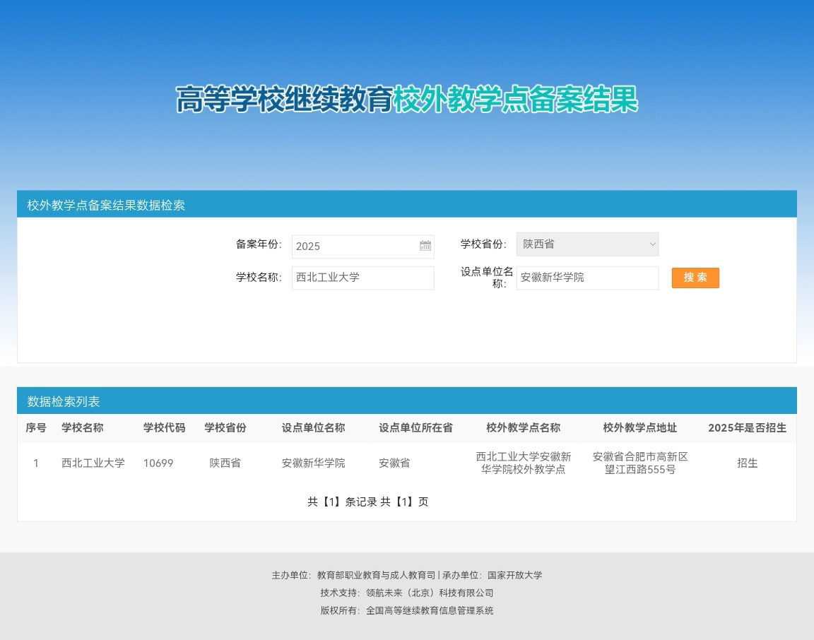 本网讯(通讯员:孙马莉)近日,安徽省教育厅印发《安徽省教育厅关于转发教育部2025年高等学历继续教育拟招生专业备案结果和校外教学点设置备案结果的通知》皖教秘高〔2025〕82号。beat365网登积极按要求申报,经西北工业大学、合肥市教育局实地考察,安徽省教育厅专家评议、教育部备案,beat365网登成功获批西北工业大学高等学历继续教育校外教学点。2025年,西北工业大学beat365在线体育官网登录入口校外教学点正式招生,开设机械设计制造及其自动化、计算机科学与技术、电气工程及其自动化、工商管理、法学等5个专升本(非脱产)专业。