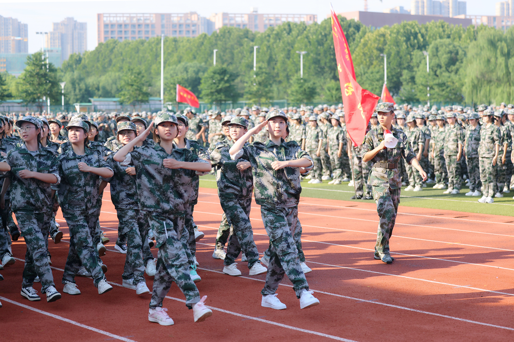 国歌雄壮,红旗飘扬。2025级新生开学典礼暨军事训练结营仪式庄严拉开帷幕。全体新生精神饱满、斗志昂扬,各方队依次进行分列式表演,步伐铿锵、口号嘹亮,展现出新华园学子顽强拼搏的精神与团结奋进的风貌,赢得在场师生的阵阵掌声。