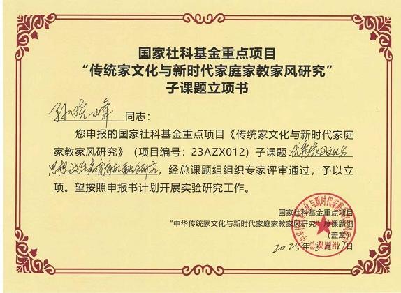 国家社科基金重点项目子课题的成功获批不仅推动了大学生素质教育研究中心家风文化育人的研究及实践,也促进了家文化与学校教育的结合。大学生素质教育研究中心将以此为契机,认真落实习近平总书记关于注重家庭家教家风建设重要论述精神,围绕重点课题开展针对性、系统性的跨学科的理论研究与实践探索,为新时代家庭家教家风建设提供有益学术借鉴。