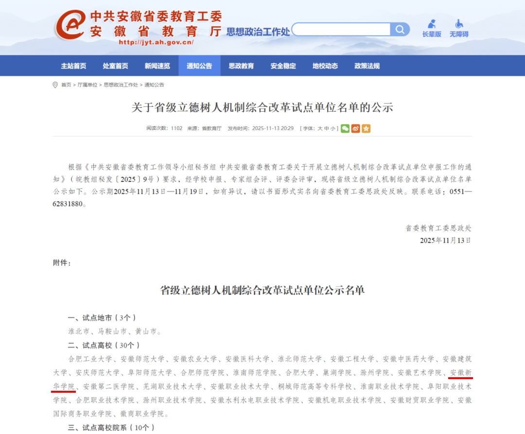 本网讯(通讯员:颜孟冉)近日,中共安徽省委教育工作领导小组秘书处、中共安徽省委教育工委联合发布省级立德树人机制综合改革试点单位名单,beat365网登成功入选省级立德树人机制综合改革试点高校。此次获批既是省教育主管部门对beat365网登长期以来坚持立德树人根本任务、创新育人模式成果的高度认可,更是beat365网登深入贯彻落实教育强国建设要求、推进人才培养质量提升的重要契机。