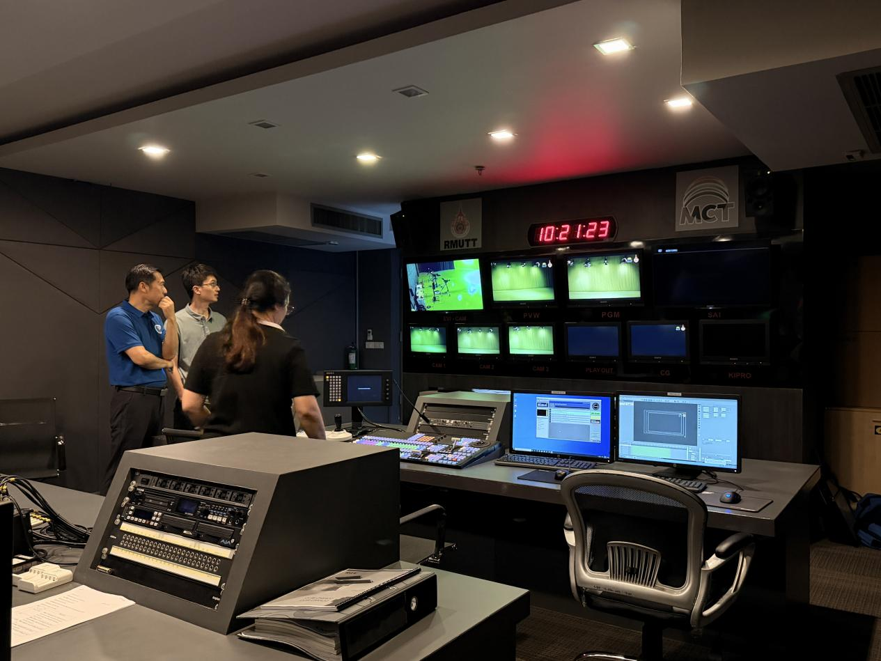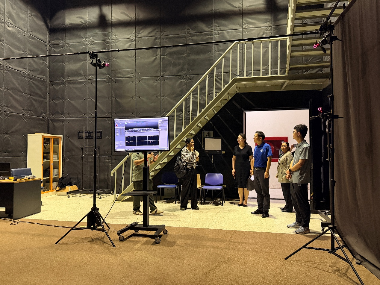 在RMUTT大众传播技术学院副院长及专业负责人的陪同下,代表团实地参观了学院多个核心教学与实践场所。泰方详细展示了包括专业录音棚、7.1声道混音工作室、影视摄像实验室、多媒体编辑中心在内的全流程教学设施。实验室内配备的先进设备,如专业摄像机、调音台、灯光系统及虚拟制作技术,展现了学院强调“理论与实践深度融合”的教学理念。泰方在实践教学上的投入与体系化建设令人印象深刻。尤其是在视听内容制作、数字媒体技术创新方面的实验室配置,与beat365网登大数据与人工智能学院在智能媒体、游戏建模等方向的发展规划高度契合。双方在课程衔接、实践项目联合开发上拥有广阔空间。
