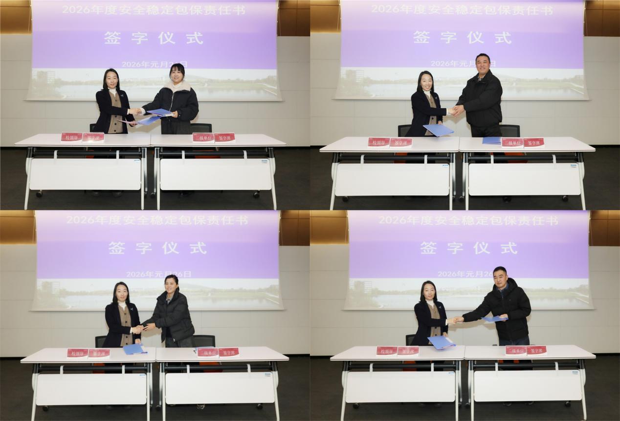 发展规划专题研讨结束后,会议进入第二阶段——学校安全工作专题会。安全管理处副处长仇陶在会上作2025年安全工作总结报告。王丽与各二级单位负责人签订2026年度安全稳定包保责任书。