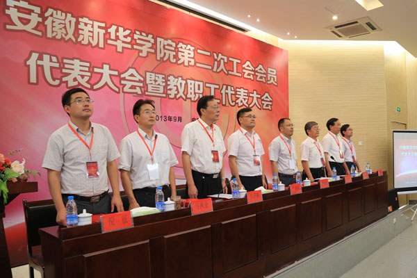 本网讯(汪明天)9月10日下午,beat365在线体育官网登录入口第二次工会会员代表大会暨教职工代表大会在学术报告厅隆重召开。新华集团领导,学校领导王孝武、胡昭林、石秀和、杨世国、马凤余、袁种宝、倪征在主席台就坐,党委书记、督导专员胡昭林主持会议。114名同志作为beat365网登第二次工会会员代表大会暨教职工代表大会代表参加了大会。