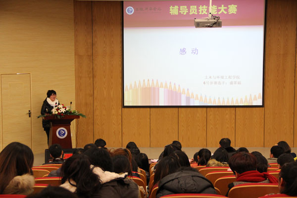 23日,17名选手展开了一场精彩纷呈的角逐,竞赛内容丰富多彩。在主题班会环节中,比赛时间为10分钟。3号土木与环境工程学院的辅导员宋红玲力拔头筹,以96分获得此次比赛的第一名。她以“珍惜……”为主题,展开对90后学生个性进行分析,通过提问、计算、思考讨论三个环节展开演说,引出珍惜亲情、友情、爱情和时间三个人生话题。并打破传统主题班会的形式,以计算的形式与学生互动,通过数字的震撼力引人发省以此告诫学生珍惜二字的人生意义。
