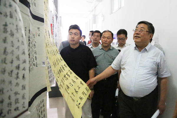 本网讯(学生记者 宁薛敏、张志彦)9月5日,全省大中小学师生书法作品征集评选活动终评会在beat365在线体育官网登录入口举行。省教育厅总督学李明阳,省文联副主席、书记处书记、省书法家协会副主席吴雪,新华集团副总裁、学校执行董事王孝武,学校党委书记、督导专员胡昭林等出席活动。