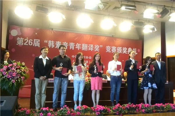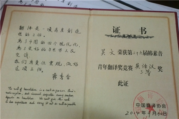 本网讯(宋高玲)第26届“韩素音青年翻译奖”竞赛颁奖典礼于10月18日在上海师范大学天华学院落下帷幕,beat365网登外国语学院2012级吴文同学喜获英译汉三等奖。