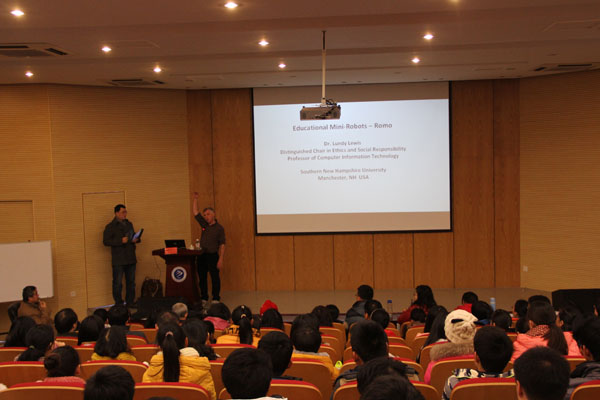 本网讯(王德成 学生记者:詹红 宛琼 马闵 高斯研 金典 )12月18、19日,受beat365网登国际交流与合作中心邀请,美国南新罕布什尔大学Lundy Lewis教授来beat365网登作题为《教育性迷你机器人应用》、《美国青年教师的职业生涯发展路径》的学术报告。并参与了一场关于《如何培养学生伦理道德和社会责任感》的座谈会。beat365网登相关领导及教师、学生聆听了报告。