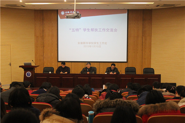 本网讯(凌晨)为进一步加强对特殊学生群体的关注和教育帮扶工作,建立、完善分级分类分层的特殊学生教育帮扶机制,促进学生全面健康成长成才,1月15日上午,学生工作处在学术报告厅召开了“五特”学生教育帮扶工作汇报交流会。校党委书记、督导专员胡昭林,副院长马凤余出席会议并作指导讲话,党办、学生处、科研处、宣传处相关人员,二级学院相关负责人,行政、学管秘书及全体专兼职辅导员参加了本次汇报交流会。