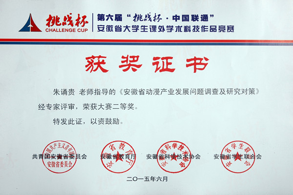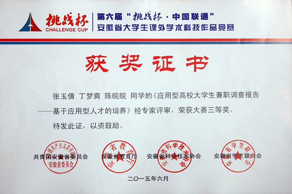 本网讯(通讯员:吕翔)6月4日至6日,由共青团安徽省委员会、安徽省教育厅、安徽科学技术协会、安徽省学生联合会共同主办的第六届“挑战杯”安徽省大学生课外学术科技作品竞赛终审决赛在安徽大学举行,经过激烈角逐,动漫学院袁磊、冯灀、邢慧、阮从芳四位同学的作品《安徽省动漫产业发展问题调查及研究对策》,土木与环境工程学院刘斌、周西好、石利军、朱琳、张志刚五位同学的作品《基于渐缩型导流槽的汽车后视镜雨眉系统》荣获二等奖;商学院张玉倩、丁梦爽、陈皖皖三位同学的作品《应用型高校大学生兼职调查报告——基于应用型人才的培养》,土木与环境工程学院房晴雨、曹路、严小丹、郑敏、夏良辰五位同学的作品《公租房项目采用住宅产业化模式的技术经济分析》,文化与新闻传播学院钱芳、陶海燕、陈小婷三位同学的作品《从传播视角论新媒体对当代大学生创新素质的影响》,药学院汪云霞、陆王明、吕来虎三位同学的作品《过碳酰胺种子包衣剂的配制及包衣研究》获得三等奖。本次大赛获奖的数量和级别均创历史最好成绩。