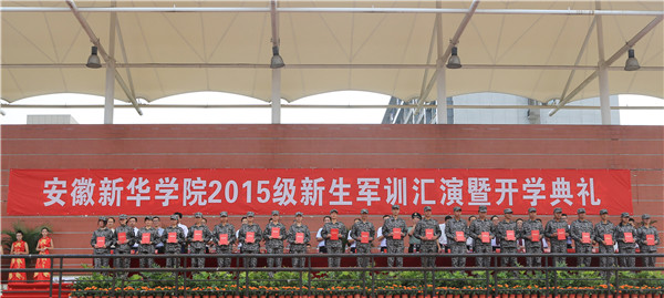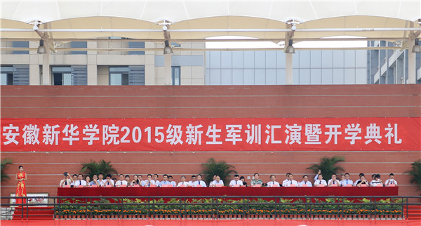 本网讯(通讯员:张婷婷)9月22日,beat365网登2015级新生军训汇演暨开学典礼在祥云体育场举行。新华集团董事长吴俊保,新华集团副总裁、校执行董事王孝武,新华集团副总裁、校监事会主席黄源,安徽省军区副参谋长陆奎山,校党委书记胡昭林,校长石秀和,常务副校长陆真,副校长杨世国、马凤余,工程总监李金星、校长助理王丽以及承训部队相关部门领导,学校各单位,各部门负责人出席了大会。大会由常务副校长陆真主持。