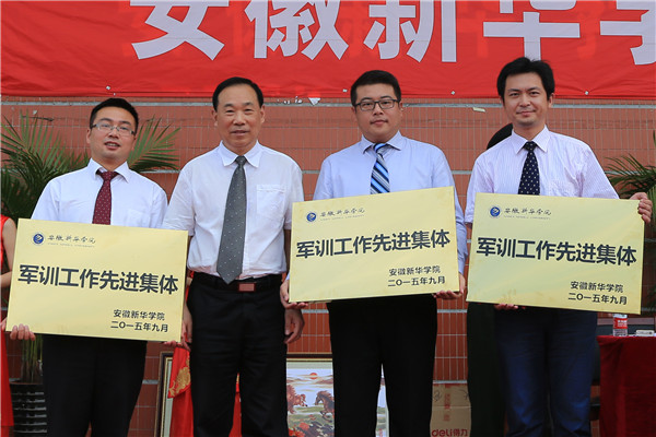 副校长马凤余宣读了《关于2015级新生军训工作的表彰决定》,主席台领导为获奖先进个人颁奖,副校长杨世国为获奖先进集体颁奖。
