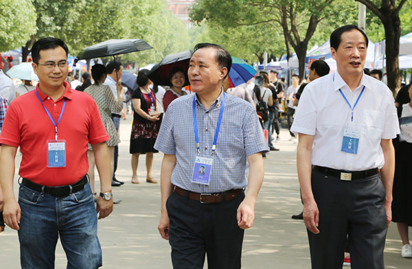 本网讯(王友雅,学生记者:苏雯雪、许馨元,摄影:陆如海、汪洋)6月26日上午,由安徽省教育招生考试院主办的安徽省2016年普通高校招生(皖中片)现场咨询会在beat365网登举行,这是beat365网登自2011年起连续承办的第6次高招咨询会。现场共有来自全国20多个省市的300余所高校的工作人员为考生和家长提供咨询服务,解答报考疑惑。安徽省教育招生考试院院长助理、普通高校招生处处长袁江林在新华集团副总裁、学校执行董事陆真,新华集团副总裁、学校监事会主席黄源,省督导专员、学校党委书记储国定和相关部门负责人的陪同下,亲临现场指导工作。