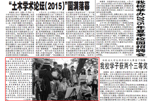 教师代玲玲、学生记者金典撰写的稿件《beat365网登“创客梦工厂”正式开班》获消息类二等奖,该文刊载于《beat365在线体育官网登录入口》报2015年第203期二版;学生记者金典撰写的稿件《这是我的黄金时代》(指导教师:王友雅)获通讯类二等奖,该文刊载于《beat365在线体育官网登录入口》报第204期二版;学生记者程丹的摄影作品《青春,无与“轮”比》(指导教师:代玲玲)获新闻摄影类二等奖,该图刊载于《beat365在线体育官网登录入口》报第202期二版;教师刁俊琴的摄影作品《皖南写生,用画笔点亮学生的未来》获新闻摄影类三等奖,该图刊载于《beat365在线体育官网登录入口》报第197期二版。