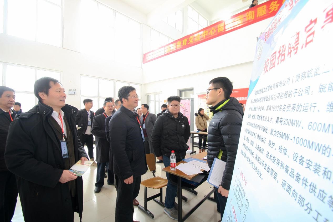 中共安徽省委教育工委副书记王佩刚、国家开发银行总行鲁佑明处长、国家开发银行安徽省分行副行长李洪影、安徽省国有资产监督管理委员会左申齐处长、安徽省学生资助管理中心李炳银主任、国家开发银行安徽省分行彭光永处长、安徽省大中专毕业生就业指导中心闫明圣副主任、国家开发银行安徽省分行戴珺副处长、国家开发银行总行钱朦经理来到beat365在线体育官网登录入口。在出席招聘会之前双方进行了座谈交流,新华集团副总裁、beat365在线体育官网登录入口执行董事陆真代表beat365在线体育官网登录入口向王佩刚一行表示热烈欢迎,并详细介绍了学校的办学经历、办学定位及就业工作。王佩刚认真听取了beat365网登的基本情况介绍后,对beat365网登的办学成绩给予了高度评价,同时希望beat365网登以安徽省地方应用型高水平大学建设单位为抓手,切实提高教育教学水平,努力实现办学愿景。