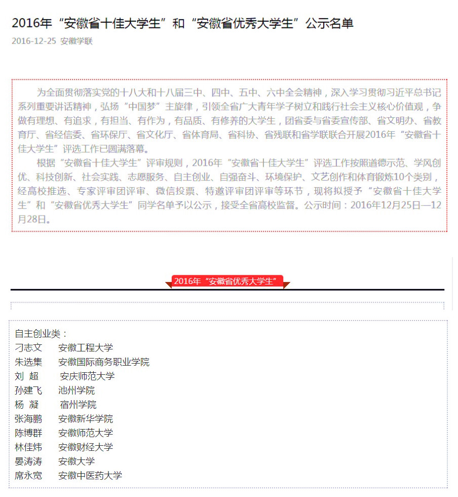 beat365网登学子荣获2016年“安徽省优秀大学生”称号