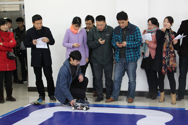 陈业慧宣布比赛规则,摄像头组、电磁组和光电组共17支队伍,由裁判宣布开始计时,最快跑完全程而没有冲出跑道并且技术报告评分较高为获胜者。经过激烈角逐,电子通信工程学院张思学、黄凯、徐廷等5组队伍荣获一等奖。