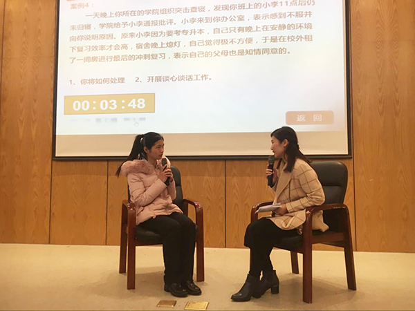在“班情熟知”环节中,参赛辅导员对随机抽取的学生基本信息了如指掌、对答如流。随后的“案例分析和谈心谈话”环节主要考察选手们综合运用各项法律、法规和教育学、心理学、生涯规划、事务管理等辅导员工作技能,对现实工作中发生的具体案例进行分析、解决的能力。他们面对学生演员故意“刁难”的情景模拟,耐心交流,悉心引导,体现出辅导员们的工作能力和工作水平。