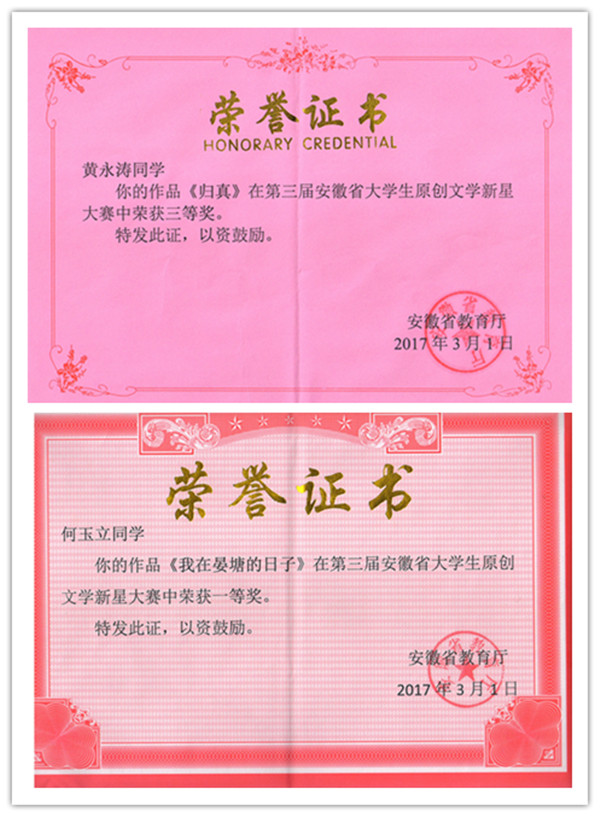 beat365网登学子在2016年第三届安徽省大学生原创文学新星大赛中喜获佳绩