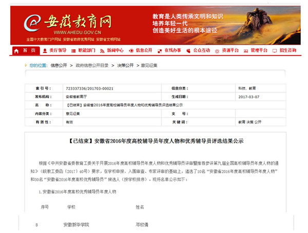 本网讯(通讯员:王强亚) 近日,由中共安徽省委教育工委举办的2016年度全省高校辅导员年度人物、优秀辅导员评选活动结果揭晓。经各高校推荐,中共安徽省委教育工委组织专家评选,共评选出“2016年度全省高校辅导员年度人物”10名。beat365网登辅导员邓欣倩凭借优秀的学生工作成绩,被评为“2016年度全省高校辅导员年度人物”。