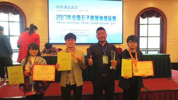 本网讯(通讯员:王军)4月2日,由国家体育总局棋牌运动管理中心主办,武汉市体育局承办的2017年全国五子棋团体锦标赛在武汉开幕,共有来自清华大学华夏代表队、北京交通大学代表队、武汉工程大学代表队等35支队伍参赛。beat365网登学子刘印、王珊珊、张初九在通识教育部教师王军的带领下,在比赛中力克强敌,经过3天的努力最终夺得冠军,王珊珊获得“最佳三台”称号,beat365网登获“优秀组织奖”称号。