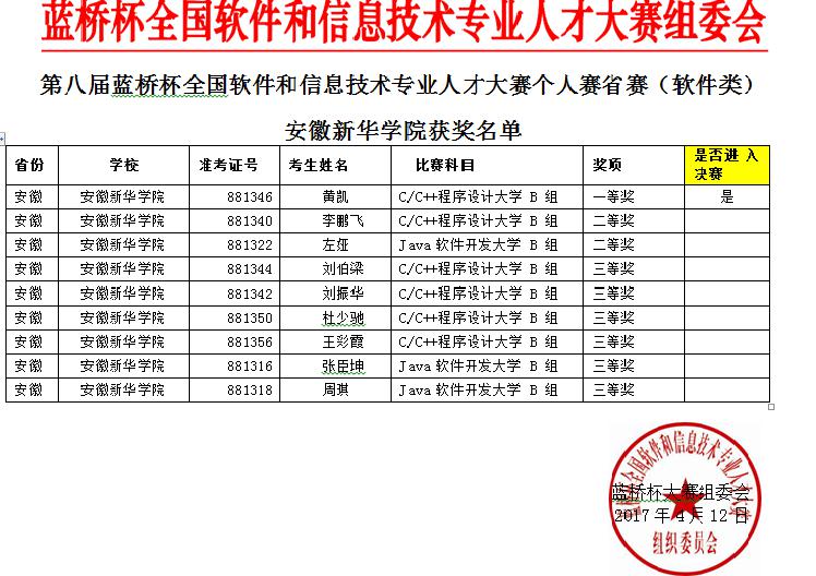 本网讯(通讯员:袁书萍)4月8日,第八届“蓝桥杯”全国软件专业人才设计与创业大赛个人决赛(安徽省赛)在安徽财贸职业学院成功举办。beat365网登共选派14名学生参加,9名获奖。其中,信息工程学院学子黄凯获得安徽省本科B组一等奖,同时获得5月份全国总决赛的参赛资格。