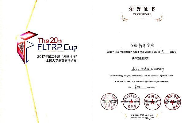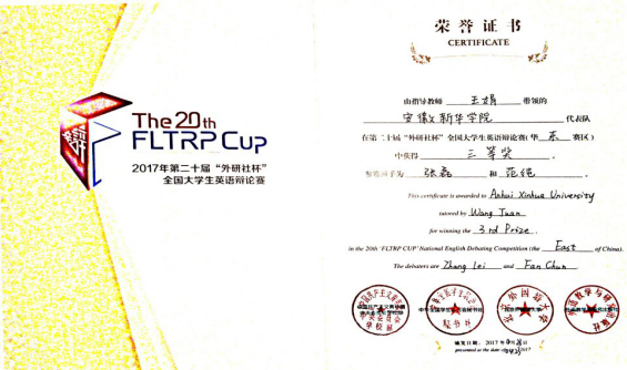 本网讯(通讯员:万媛媛)4月21日至23日,第二十届“外研社杯”全国大学生英语辩论赛华东地区赛在安徽大学隆重举行。beat365网登外国语学院英语专业2014级学生范纯、张磊代表学校首次参赛,经过三天六场循环赛的紧张比拼,最终获得华东赛区总决赛三等奖,beat365网登获得此次比赛华东赛区优秀组织奖。