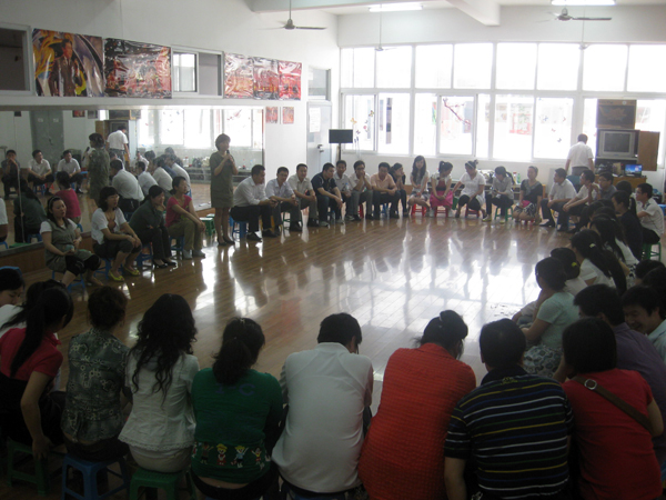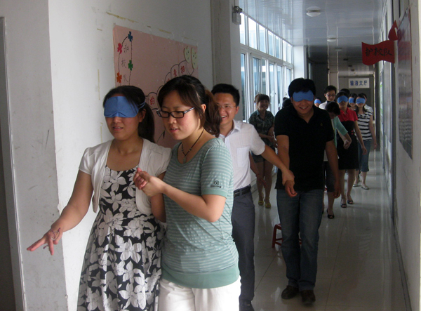 为让辅导员尽快进入游戏角色,培训由趣味横生的“微笑握手、传递心愿”热身游戏开始。接着,方老师通过“团队跳跃”、“心有千千结”、“信任之旅”等游戏,让学员学会了在团体合作中如何更好地分工合作,运用团体智慧的方式来解决问题,也增强团队凝聚力。