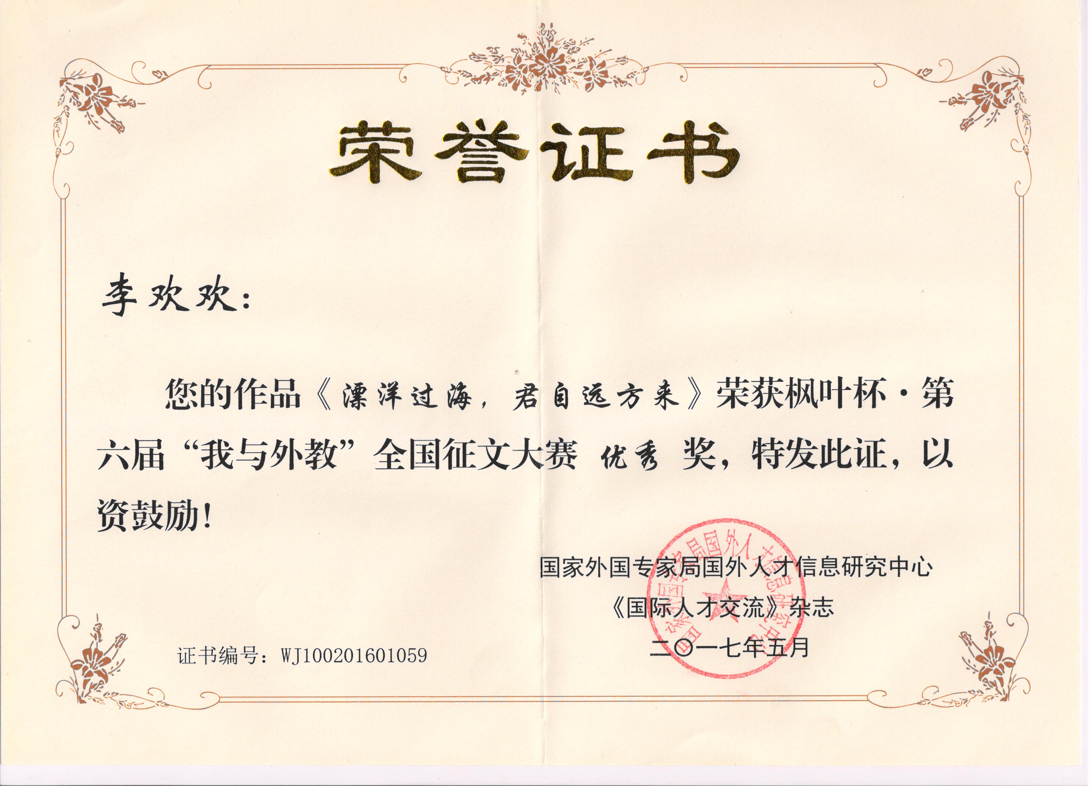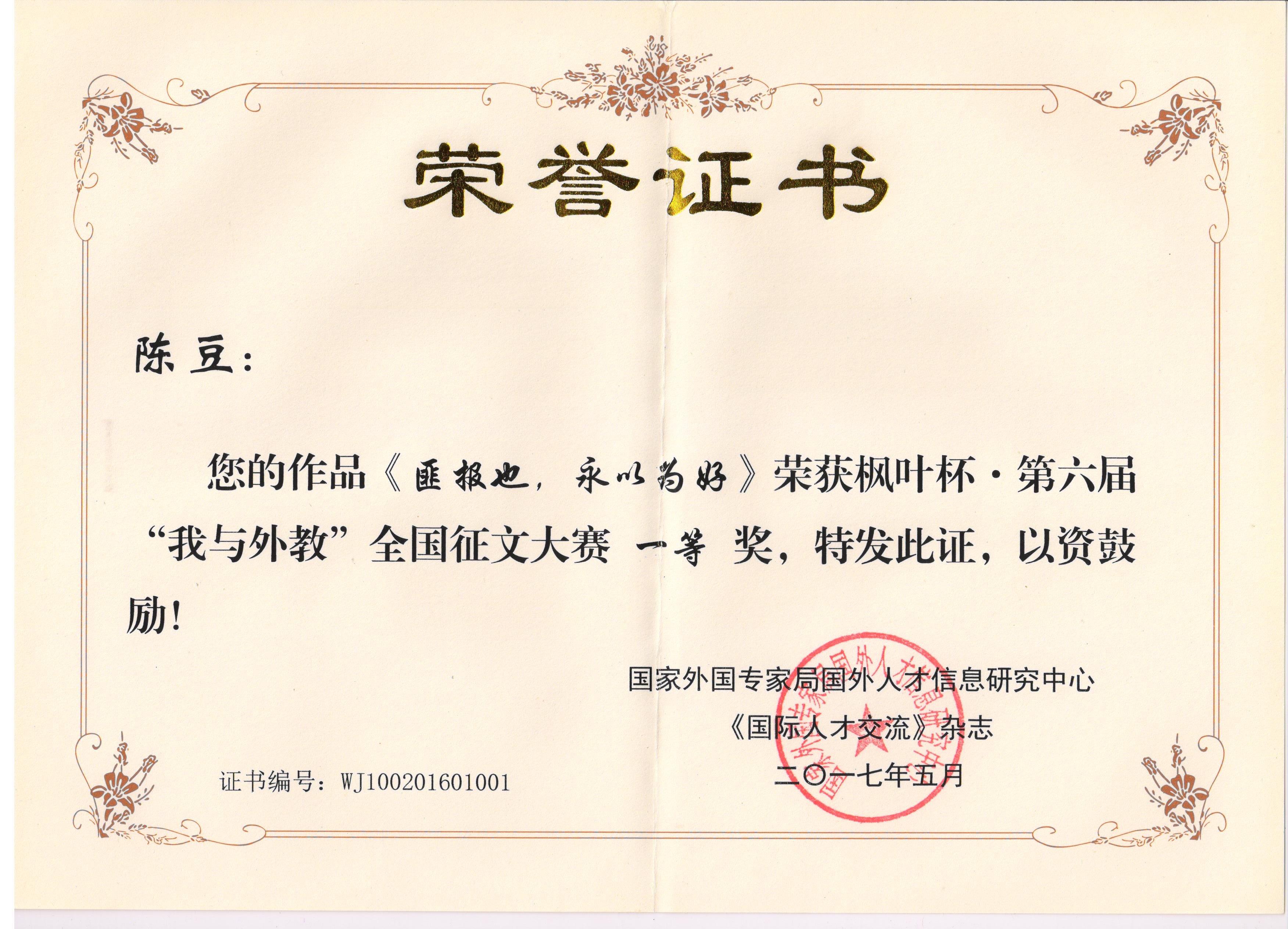beat365网登在“枫叶杯”2016“我与外教”全国征文大赛中喜获佳绩