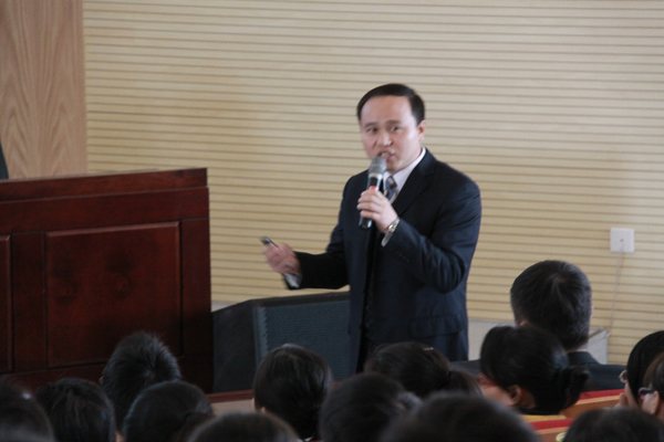 随后,岳耀欣副总经理以通信行业的现状及未来为主题开始了精彩的讲座。首先他通过近年“通信专业毕业生就业分配”和“薪酬水平”两方面的数据分析了就业现状,再以多年的工作经验为即将毕业的同学们指出全球通信行业的发展动向。讲座中,岳经理以自己亲身经历,对通信岗位进行了包括人生职业规划、就业定位等内容的分析,鼓励大家确定好自己的人生目标,并以讯方公司的概况阐述了现在以及未来培训认证的需要。岳经理用亲切、幽默的话语把大学生求职的典型事例生动的展现给同学们,为在场的同学们扫除了求职路上的暗雷。