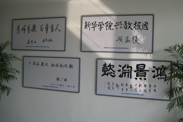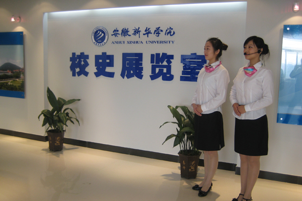 我院校史展览馆位于图书馆五楼,共有三间展室,第一间展室为胡锦涛总书记讲话节选、领导题字和主题墙;第二展室为“领导关怀篇”、“前言篇”和新华历史,展室内还展示了部分珍惜的历史实物;第三间展室为“今日新华篇”和“展望篇”,陈列柜上展出了我院获得的部分荣誉奖牌。校史展览馆内配有经严格训练的解说员。