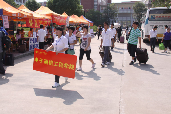 一进学校大门,就有穿着校服的学生会人员带领新生报名,对于不是本学院的新生,会帮他带到其所属的学院。记者采访了一名电子通信工程学院学生会接待人员李凯旋,他说:“每天早上6:50就要到岗,一直工作到晚上7点,每个接待人员一上午最多可以迎接3名新生。有些新生在晚上才到校,此时学校的报道工作都已经停止了,学校有专门宿舍给来学校较晚的新生住,我们会把他们带到临时住宿的地方,把联系方式留给他们,第二天再办理缴费手续。”李凯旋见一家长进了学校,立马上向家长问好然后积极的接过手上的行李,带着他们去办理入学手续。路上,李凯旋向他们介绍学校的各个方面。经过图书馆的时候,他介绍到:“这是我们学校的图书馆,里面藏书很多,平时下课可以来这里看书学习。”胡叔叔说:“你们的服务让刚来的新生和家长省去了很多麻烦,如果没有你们的帮助,估计我们把手续办完要花很长时间。”