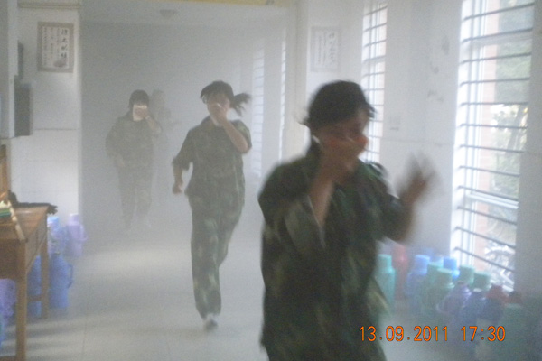 下午五时许,随着火灾警报声拉响,消防演练正式开始。公寓楼内烟雾弥漫,广大学生每人手中各拿一条湿毛巾,紧捂住口鼻,按照应急疏散路线,安全、有序的朝公寓楼安全出口处紧急撤离,到达安全地带。