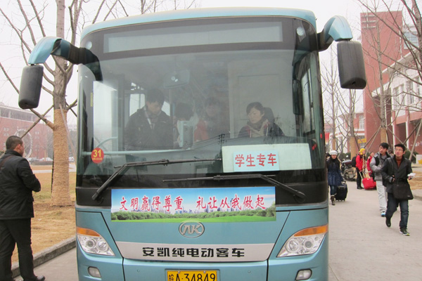 1月8、9、10日三天,数辆801路公交车缓缓驶入校园,早已排队等候的学生有序登上公交车,公交车很快就坐满了学生,快速驶往汽车站和火车站。
