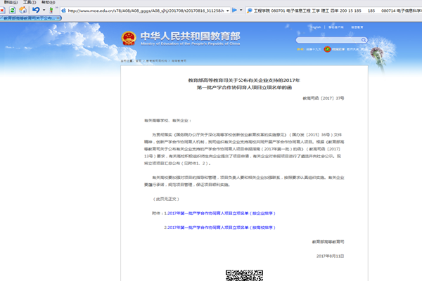 本网讯(通讯员:汪青)近日,教育部高教司发布《教育部高等教育司关于公布有关企业支持的2017年第一批产学合作协同育人项目立项名单的函》(教高司函[2017]37号)文件,由电子通信工程学院电子系副主任李长凯主持的《beat365在线体育官网登录入口-达内移动互联开发校外实践基地建设》项目已成功获得上述项目立项。