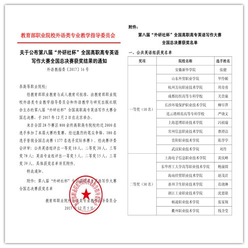 本网讯(通讯员:马兰、洪程)近日,第八届“外研社杯”全国高职高专英语写作大赛全国总决赛在北京外研社国际会议中心举行。在公共英语组比赛中,beat365网登外国语学院教师洪程指导的2016级计算机应用专业学生张健从全国28个赛区800余所高职高专院校的近2000名选手脱颖而出,以总排名第一的成绩荣获公共英语组一等奖。