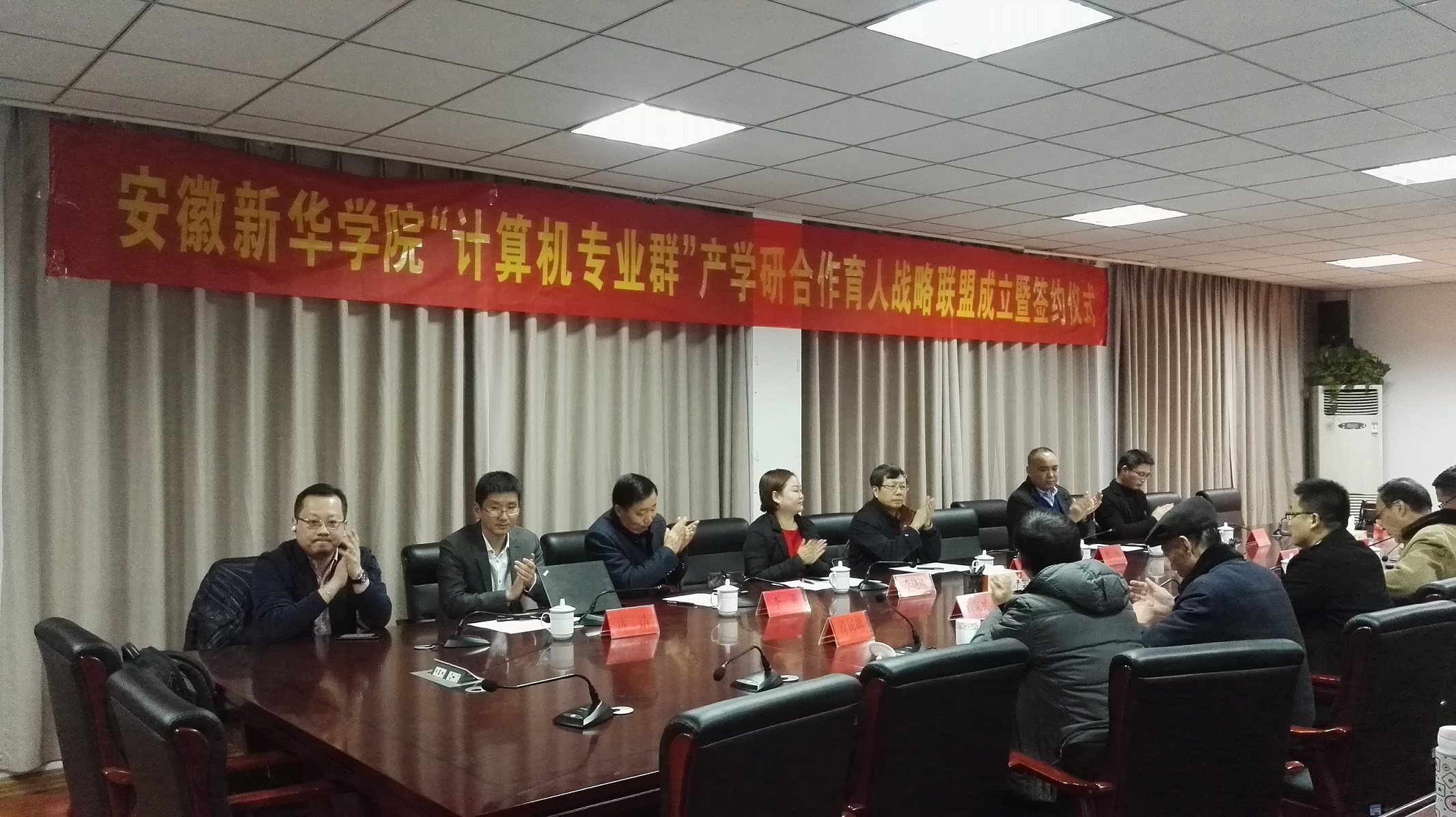 本网讯(通讯员:聂欢欢)12月20日,beat365网登“计算机专业群”产学研合作育人战略联盟成立暨签约仪式在第一会议室顺利举行。校长石秀和、中国科技大学教授及安徽计算机学会秘书长徐云、合肥学院计算机系系主任檀明、合肥城市云数据有限公司常务副总经理李晓洁、华信智原安徽分公司总经理李勇、中软国际有限公司安徽分公司经理韦东成、联想安徽分公司经理庞浩、翡翠集团安徽分公司经理吴涛、科研处副处长王琦进、信息工程学院全体管理人员以及部分教师代表参加了仪式。会议由执行院长贺行佳主持。