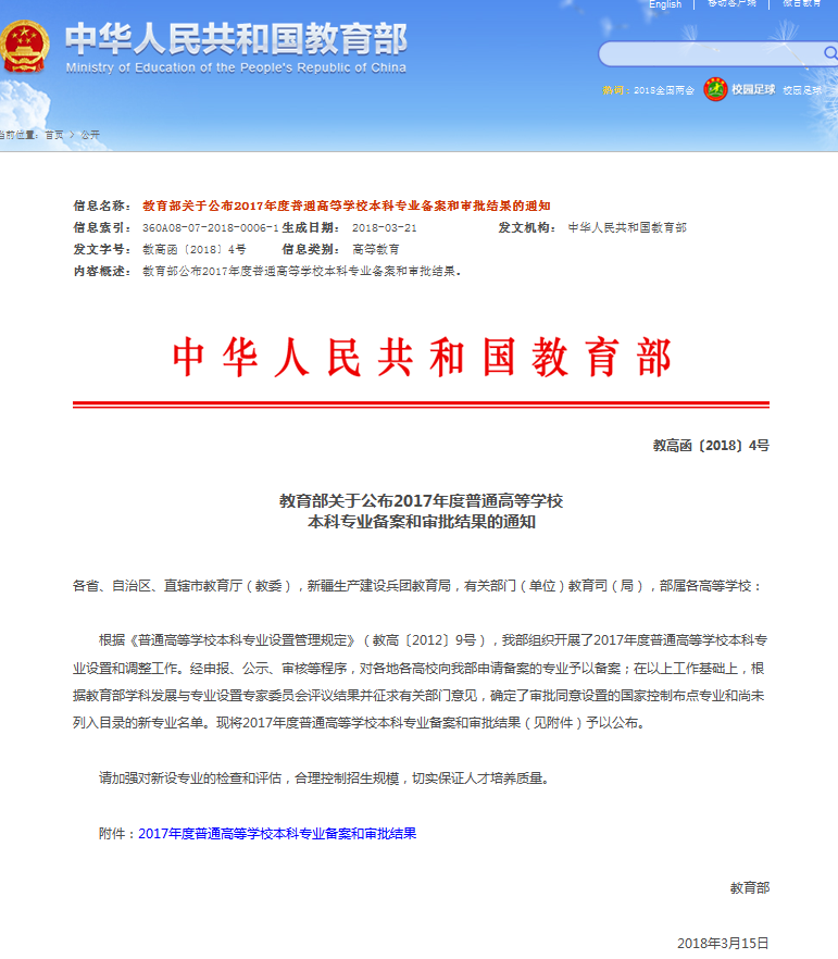 本网讯(通讯员:冯雪峰)近日,教育部下发了《教育部关于公布2017年度普通高等学校本科专业备案和审批结果的通知》(教高函〔2018〕4号),beat365网登申报的数据科学与大数据技术(080910T)和健康服务与管理(120410T)两个本科专业获教育部批准备案,自2018年起开始招生。