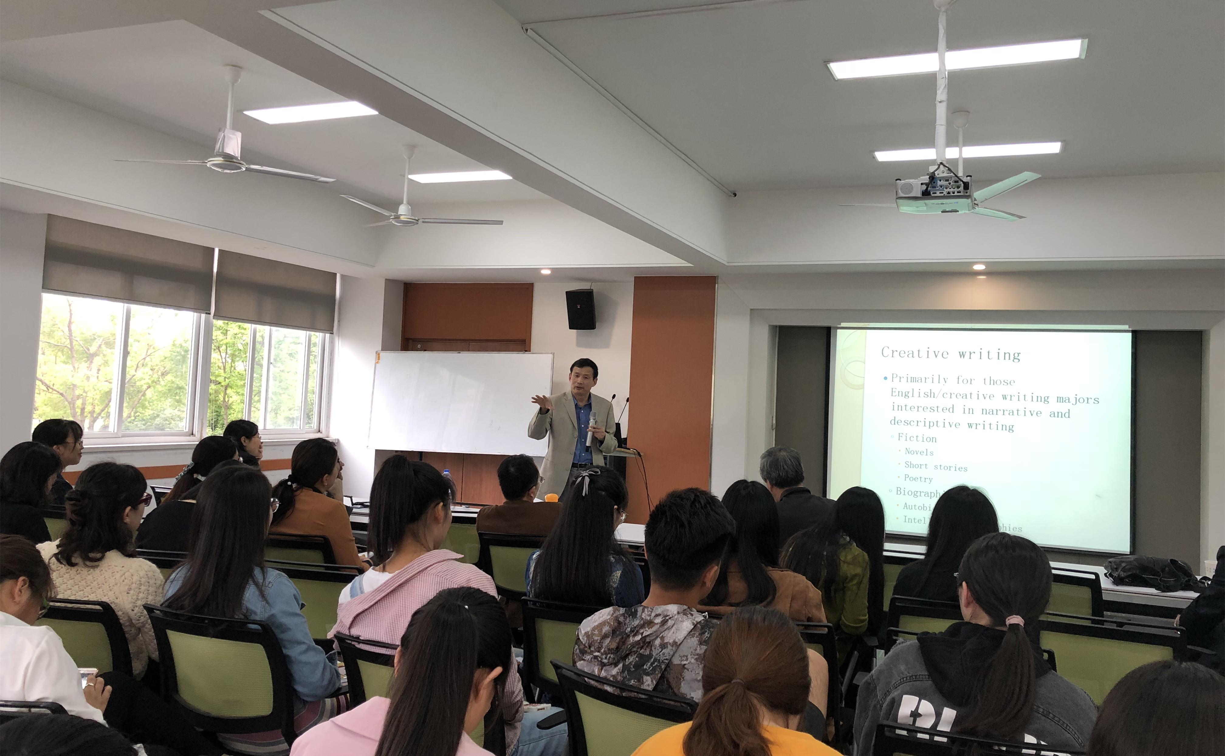 讲座首先由Sean Lancaster教授针对文化、语言和技术的融合进行展开,他介绍了语言景观研究的维度和视角,分析了把语言景观理论运用到如何让英语母语者来帮助他人提高交际能力;Cooper教授的主题围绕文化在语言习得中的重要性展开,从比较的视角来研究语言和文化在微观与宏观方面的关联,并利用视频材料演示了不同的英语教学方法带来的教学效果;Shinian Wu教授结合自身以英语古典文学专业毕业生的经历,向在场各位介绍了美国英语专业学生的职业前景。讲座期间,国际教育学院、外国语学院师生与三位教授踊跃互动,气氛热烈。