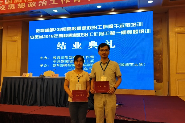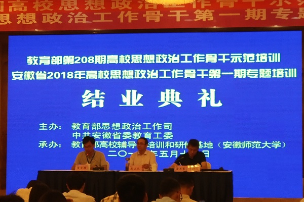 本网讯 (通讯员:周景、苏荣萍) 为深入学习宣传贯彻落实习近平新时代中国特色社会主义思想和党的十九大精神,把全国全省高校思想政治工作会议精神贯彻落实引向深入,进一步提高高校思想政治工作骨干的综合素质和能力水平,根据《高校思想政治工作质量提升工程实施纲要》《普通高等学校辅导员队伍建设规定》和《安徽省高等学校辅导员培训计划(2016-2020年)》要求,教育部高校辅导员培训和研修基地(安徽师范大学)于5月16日至5月18日举办教育部第208期高校思想政治工作骨干示范培训暨安徽省2018年高校思想政治工作骨干第一期专题培训。本次会议共有近300名全国高校代表参加,外国语学院副院长周景、财会与金融学院辅导员苏荣萍代表beat365网登参会。