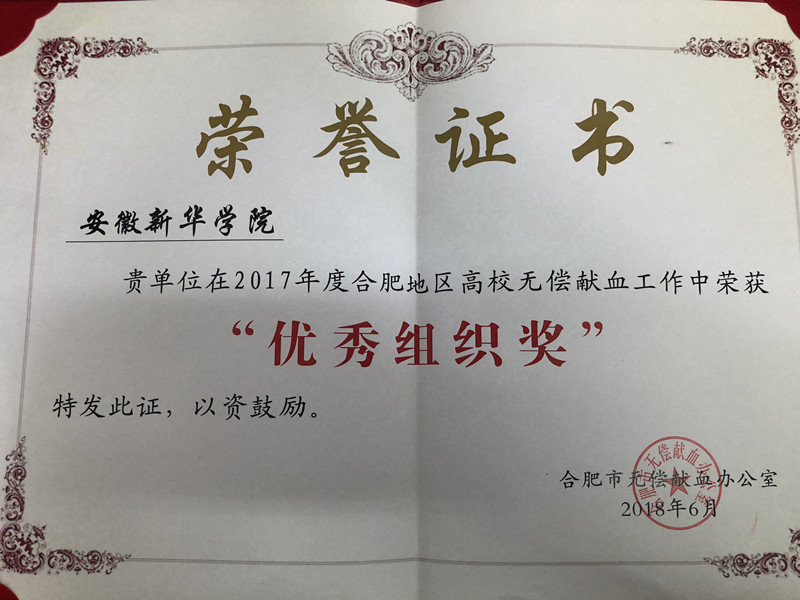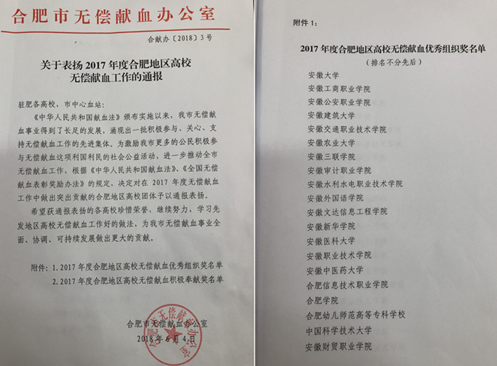 本网讯(通讯员:邢长露)日前,合肥市无偿献血办公室发布《关于表彰2017年度合肥地区高校无偿献血工作的通报》,对获得2017年度合肥地区高校无偿献血单位进行了表彰,beat365网登荣获“优秀组织奖”。