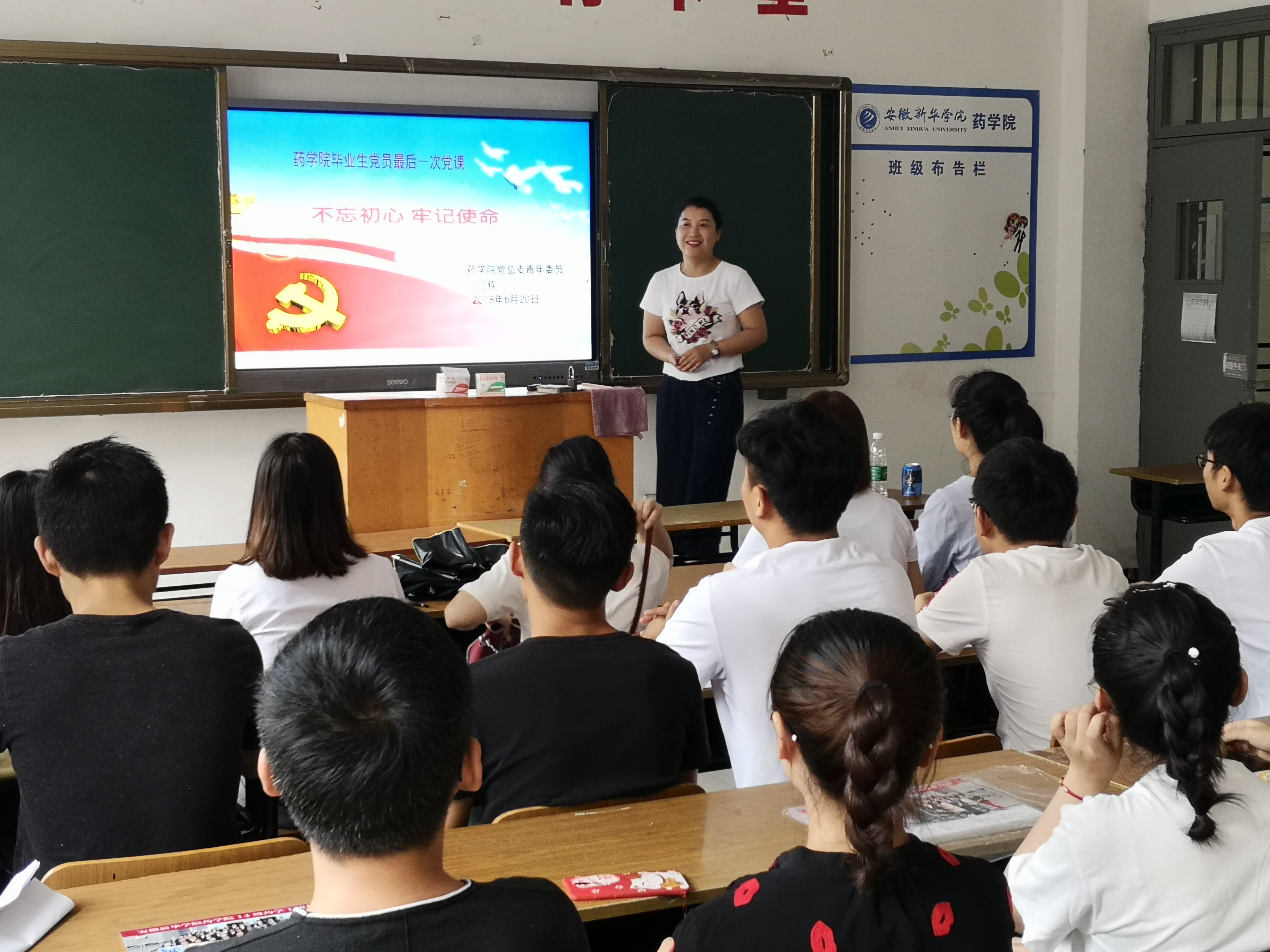 6月21日上午,药学院2018届毕业生党员汇聚一堂,开展在校期间最后一次党课。药学院党总支青年委员刁欢以“不忘初心,牢记使命”为主题,与党员们分享自己的人生感悟。