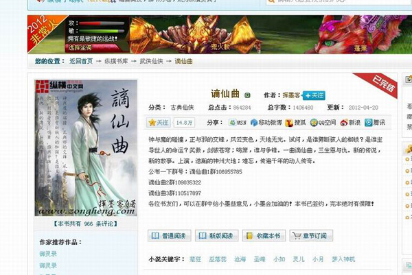 《谪仙曲》于2010年2月开始上传网络。2010年4月成功被纵横中文网签约。到2010年11月30日完成连载,共耗时十个月,总字数140万字,在此期间,李进更是凭这本小说获得总计一万三千元人民币的收入。