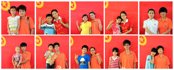 活动结束后,小学生们纷纷与志愿者在团旗前合影留恋