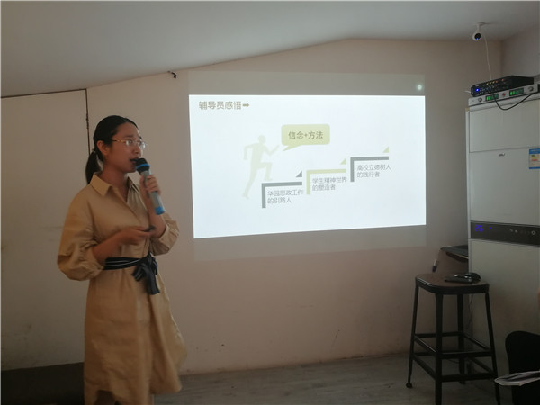 首先,辅导员刘晓蓉介绍了前往安徽工程大学参加“学工人员体验式拓展”培训的历程和心得体会。她表示,体验式拓展培训在学生管理中可以起到很好的引导启发作用,应该成为辅导员在班级管理、学生素质养成等方面的重要抓手。“00后”逐渐成为辅导员们主要面对的群里,对“00后”的管理,也要与时俱进,不能一味地向学生提要求,辅导员在有责任、有情怀的同时,还要有方法,有措施。同时,辅导员专业水平的提升不应该仅靠闭门学习,或局限于学院内部交流,更应该走出去,多和其它兄弟院校的辅导员开展交流学习,开拓自己的视野,学习先进的班级管理理念和方法。