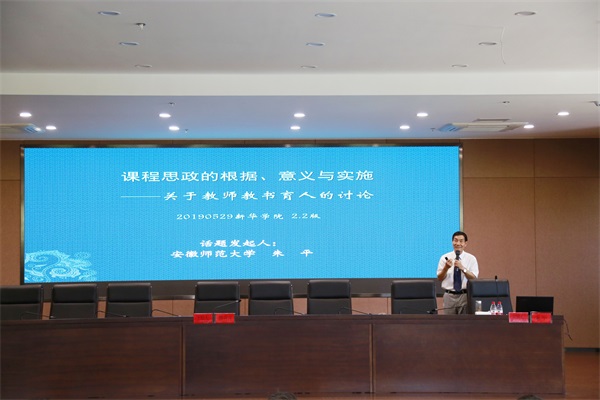 活动邀请了安徽师范大学马克思主义学院教授、博士生导师朱平教授,围绕活动主题,分别从“课程思政的含义根据与实施”、“课程思政的基本路径”、“课程思政的难点及应付”等五个方面展开。帮助教师学懂弄通“课程思政”的精神实质,强化教师的立德树人意识,激发教师参与课程思政建设的内在动机。同时,引导教师根据不同专业人才培养特点和专业能力素质要求,科学合理设计思想政治教育内容,探索在每一门课程中有机融入思想政治教育元素的具体路径和方法。