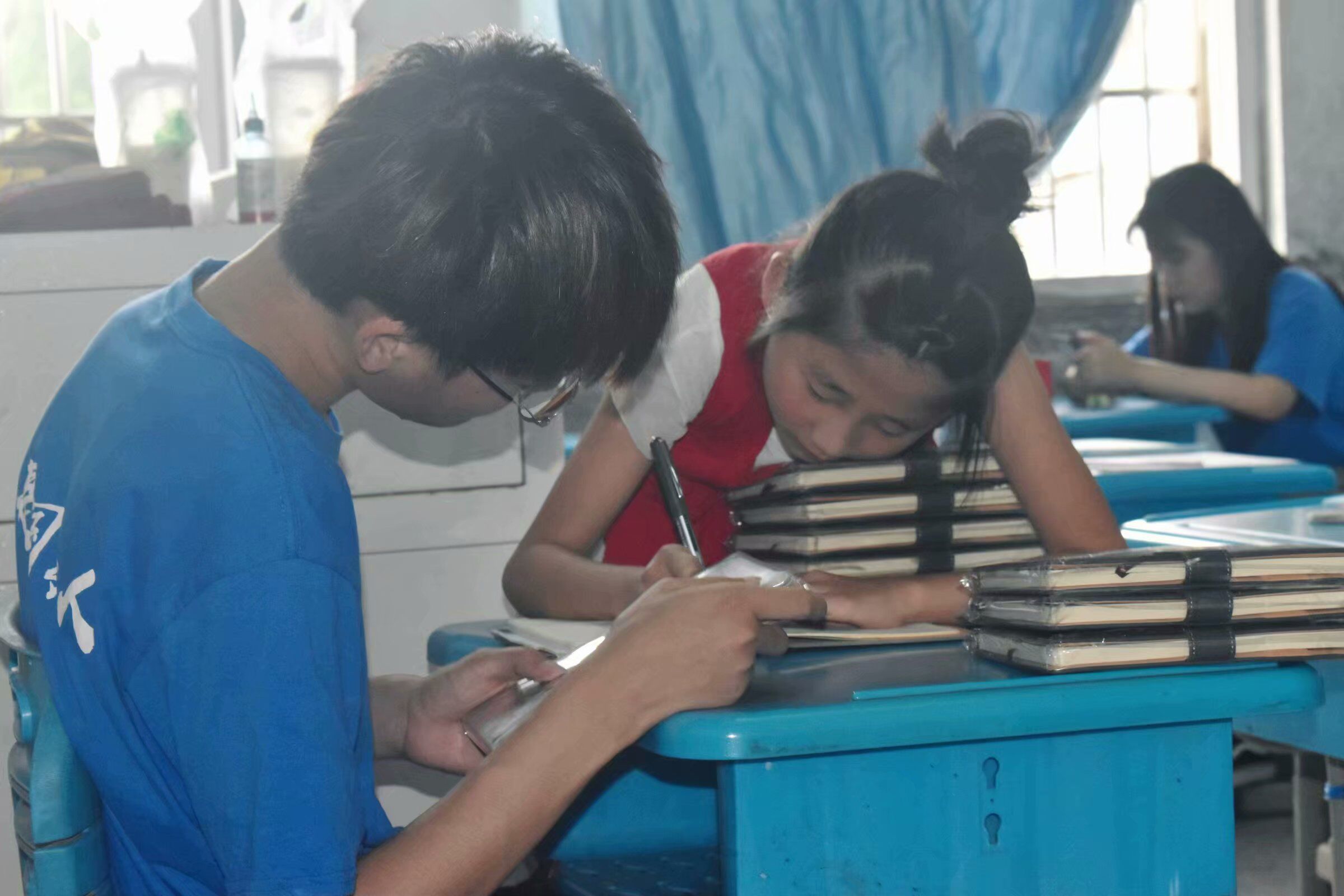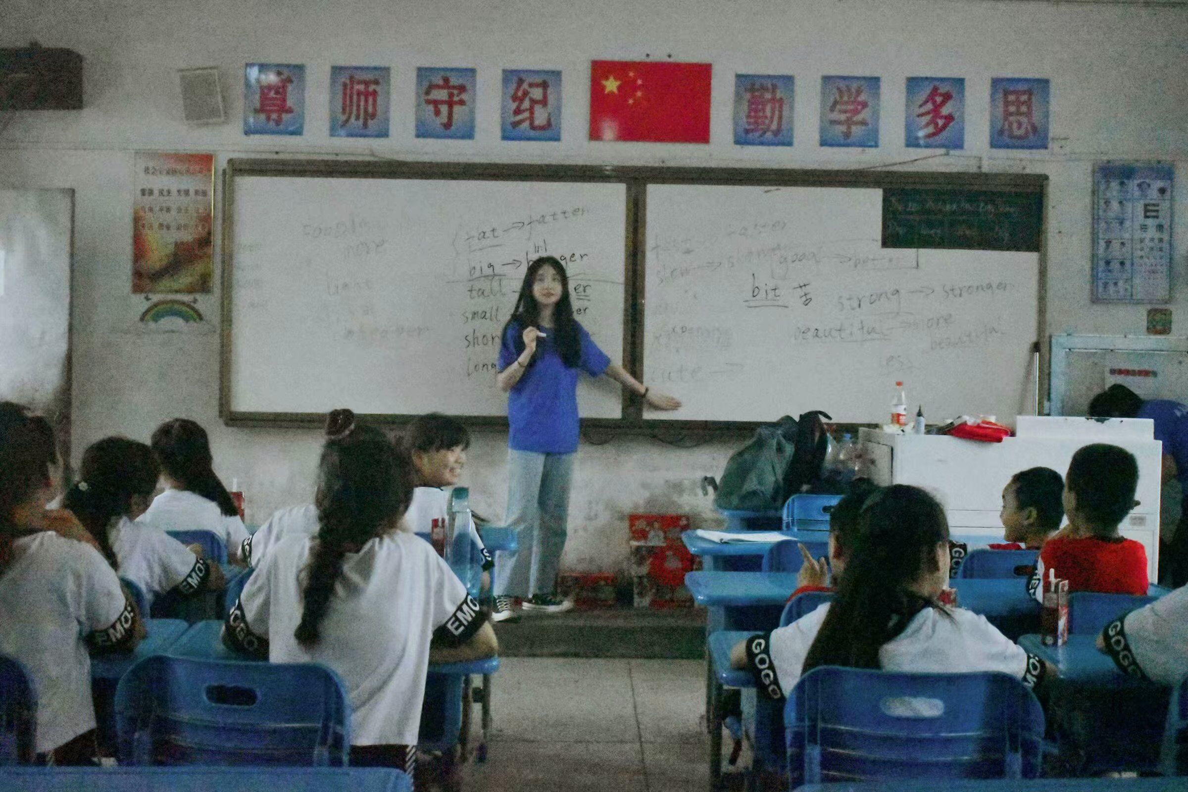 实践队员们拿着精心准备好的备课本在向小朋友们讲解着英语题,认真的样子十足像一位老师。而孩子们坐在下面认真且好奇地听着老师讲的每一句话,待老师提问问题或者请大家上来讲台解题时,大家又是非常积极踊跃地举手,生怕自己被老师落下了。