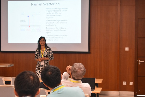 7月19日,在重庆大学理工学术报告厅听取专家报告。本次学术报告由重庆大学董立春教授主持,他首先感谢了现场的国内外的专家教授的参加,并对会议流程进行了介绍。本次会议有8位专家对各自领域的研究成果做了精彩的报告,并穿插了部分海报作者对各自展示的海报进行说明。其中,来自加拿大瑞尔森大学的Bo Tan教授分享了量子点在生物传感中的研究,通过研究说明量子点在生物传感中针对SERS具有广阔的研究前景。此外,纽约城市学院的Yi Pan教授对材料制备技术领域内容的最新研究作主旨报告。
