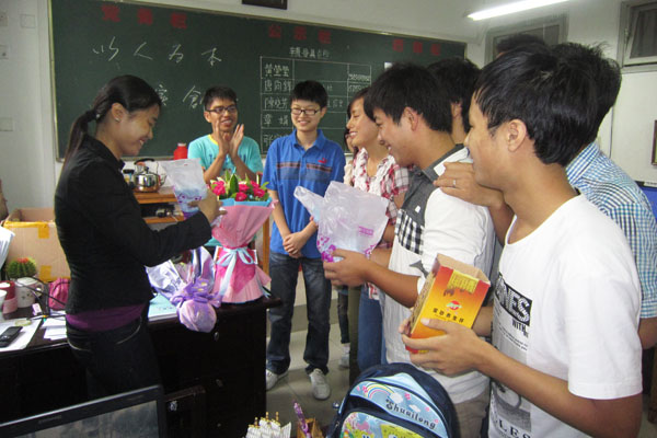 “上课”“起立”“祝老师节日快乐!”早上8点,电子楼的教室里响起了让人感动的祝福声。学生会的同学们为领导和老师们送上了鲜花和贺卡,每张贺卡都写满了长长的祝福和浓浓的谢意。该院助理团的同学们用很新颖的“抽礼品”的方式将“感谢师恩”活动的现场气氛推向了高潮。在校同学为老师准备小礼物,给遇见的每位老师鞠躬行礼;往届毕业生一早就给老师发祝福短信。